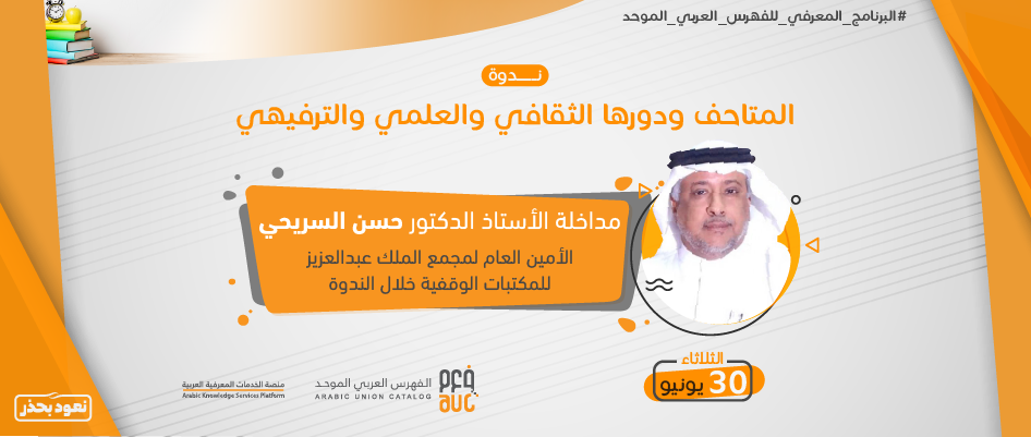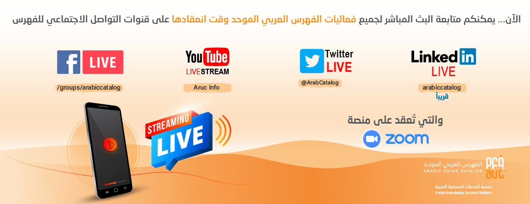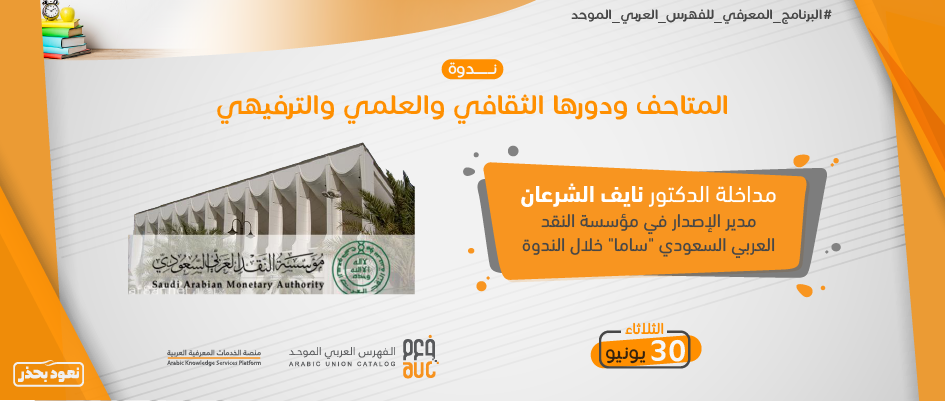 7 July 2020 In Al-Madinah Al-Munawwarah, Dr. Hassan Al-Saraihi discusses the King Abdulaziz Complex for Waqf Libraries Museum. 7 July 2020 The Saudi Arabian Monetary Authority's Currency Museum is explained by Dr. Naif al-Shar'an 10 June 2020 Bringing the Arab nation's memory to the world... 8 June 2020 Coming soon... New releases from the Arabic Union Catalog 18 May 2020 The AUC has launched its "AUC Podcast" service 10 May 2020 Live broadcasts of all Arabic Union Catalog events are available. 21 April 2020 Evenings with the Catalog during Ramadan 16 April 2020 Information sources about the Coronavirus pandemic (COVID-19) are added to the Arabic Union Catalog's bibliographic database. 5 April 2020 The Arabic Union Catalog launches the initiative #Invest_Your_Time_in_Reading. Pagination First Page First page Prev Previous page 1 2 3 4 5 6 … Next Next page Last Page Last page